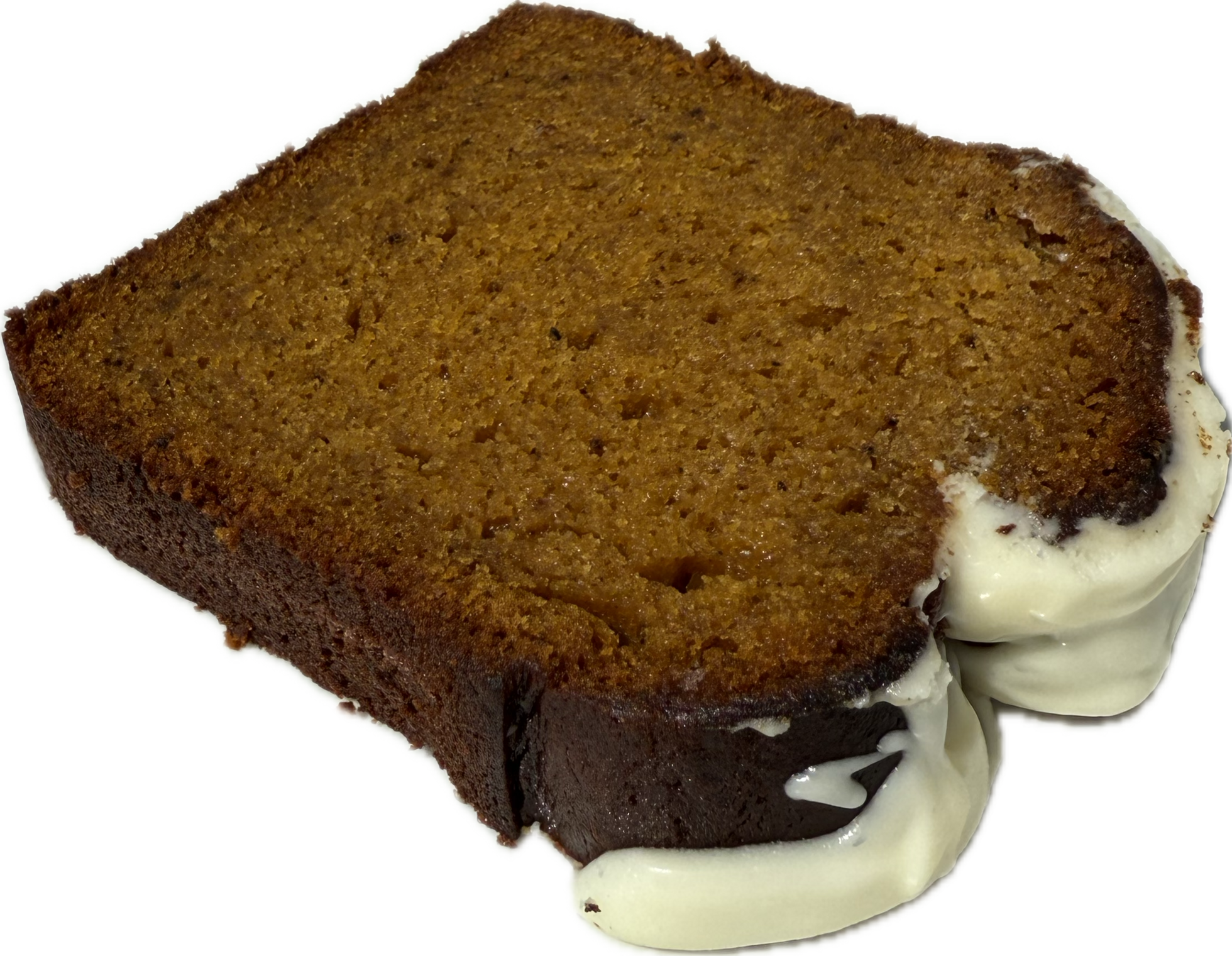 Moist pumpkin bread topped with cream cheese frosting. Each slice is approximately 4" x 4" and .75" thick.